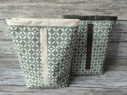 Aus beschichteter Baumwolle genäht und mit Druckknopf verschließen - praktisch für unterwegs